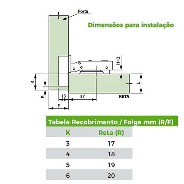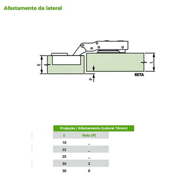 Dobradiça caneco grande, embutida, para portas sobrepostas e recobrimento total.Indicada para painéis ripados, portas espessas ou com moldura de madeiras, até 35mm de espessura.