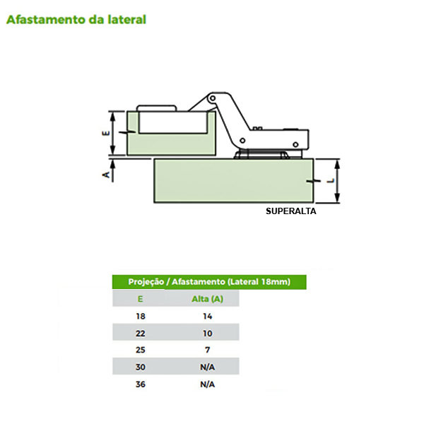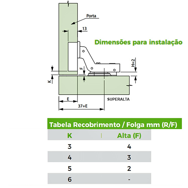 Dobradiça caneco grande, embutida, para portas embutida.Indicada para painéis ripados, portas espessas ou com moldura de madeiras, até 35mm de espessura.